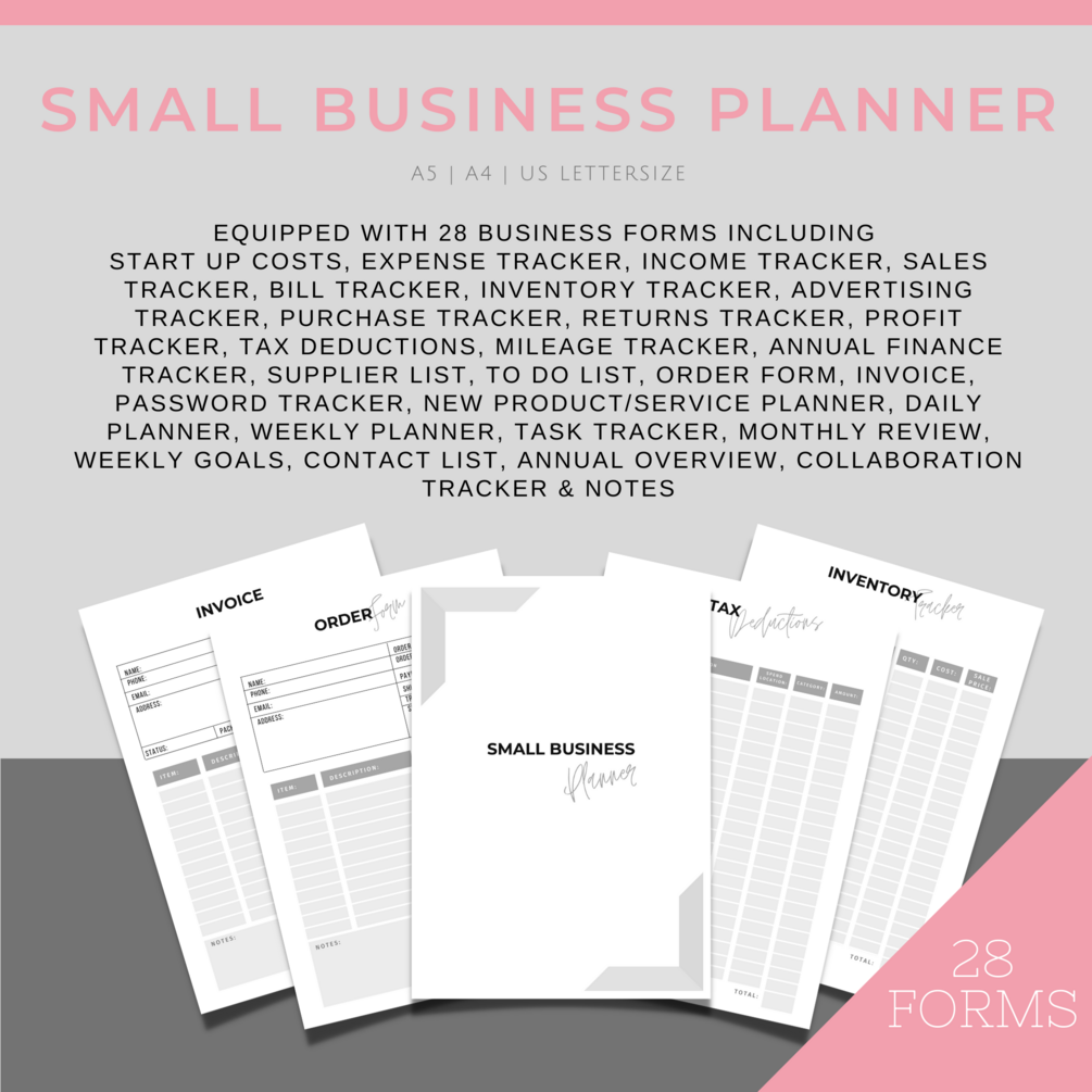 - Business Planner - Equipped with 40 business forms including start up costs, expense tracker, income tracker, sales tracker, bill tracker, inventory tracker, advertising tracker, purchase tracker, returns tracker, profit tracker, tax deductions, mileage tracker, annual finance tracker, supplier list, to do list, order form, invoice, password tracker, new product/service planner, daily planner, weekly planner, task tracker, monthly review, weekly goals, contact list, annual overview, collaboration tracker & notes and more!